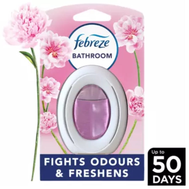 Febreze Bathroom Air Freshener fights odours and leaves a light fresh scent. Helps prevent odours from lingering. Leaves behind a light fresh scent. Long-lasting for up to 50 days. Easy to use, 1 push button activation. No battery or electricity needed. Discreet as well as stylish. Blossom & Breeze fragrance is inspired by the freshness of delicate soft petals