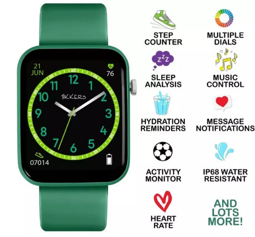 Introducing the ultimate tech accessory from Tikkers, our stylish Series 13 has a host of fantastic features and functions that your active kids and teens will love. They can keep in touch with friends & family with a great range of call alerts, message & social notifications, though of course if that's not your thing, you can switch alerts off within the Tikkers Time app. They can easily keep on top of all their activity, with built in step counter, heart rate monitor, sports tracking, GPS connection, weather alerts and more.