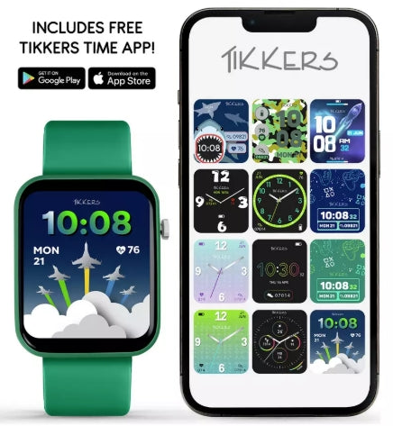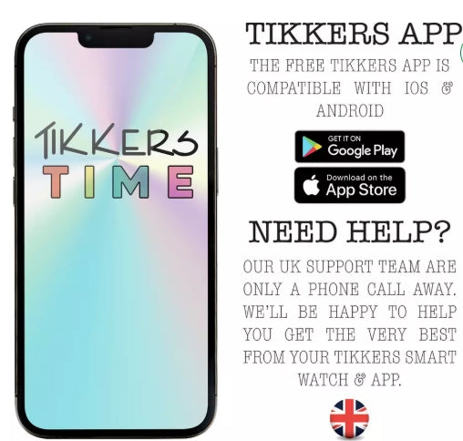 The free Tikkers Time app is designed to enhance your Tikkers experience. Presented in a great gift box, including charger. IP68 Water Resistant. 1.69" Screen with touch navigation. Distance and steps tracking, hydration and sedentary reminders, breathing exercises.